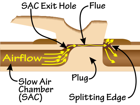 Cut-away image of a Native American flute, showing the SAC exit hole, airflow, ramp, flue, and splitting edge