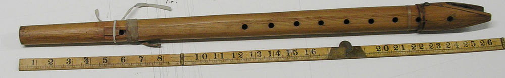 Remarks: Cylindrical body constructed of three sections of cane connected by crudely fitted socket-and-tenon joints. Proximal end of uppermost joint cut at steep angle. Bands of cotton (?) string wrapped in six places (missing or detached in four places). U-shaped window with widely chamfered lower edge. Duct block missing, but apparently held in place by pin (length 25 mm) carved from cane, protruding through wall of uppermost section about 15 mm from proximal end. Two fingerholes and one thumb hole, with chamfered edges, near distal end of lowest section.1