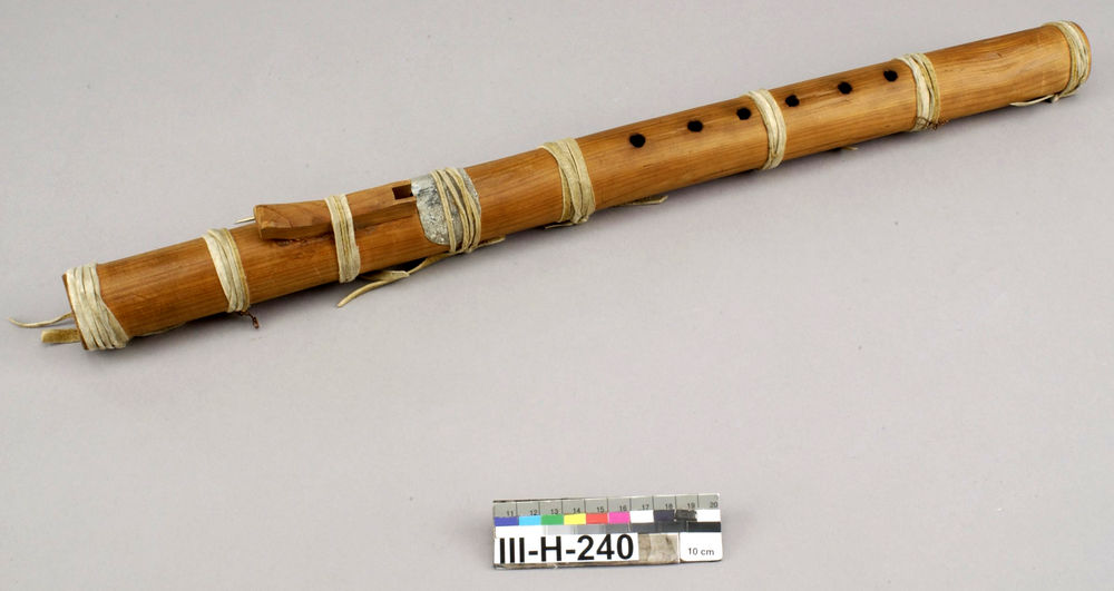 Remarks: Inventory Description: Wooden flute, lead-capped end, wooden stopper tied with leather, painted red.1